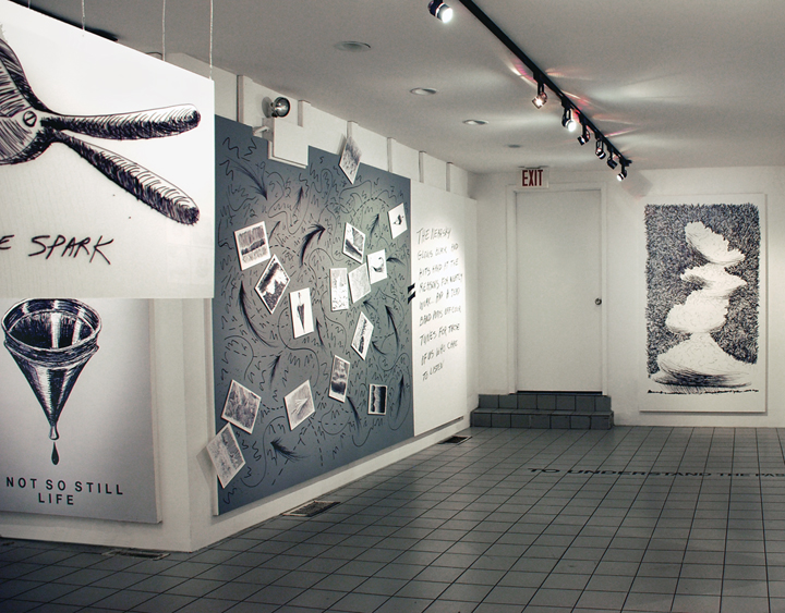 Wall drawings, hanging plexi panels, unique drawings, typography, 2009 > <